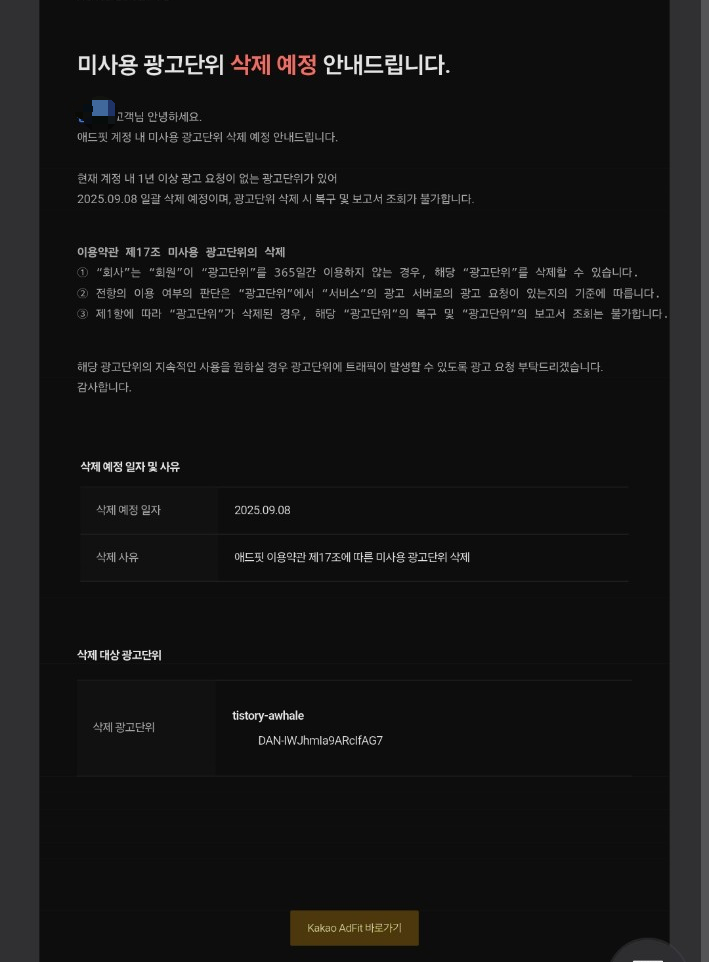 그런데 문제는, 만들어놓기만 하고 실제 글에 붙이지 않으면 → 1년 동안 광고 요청이 0으로 집계되고, 카카오 애드핏이 “이건 안 쓰는 거네?” 하고 삭제 안내를 보내는 것이다.