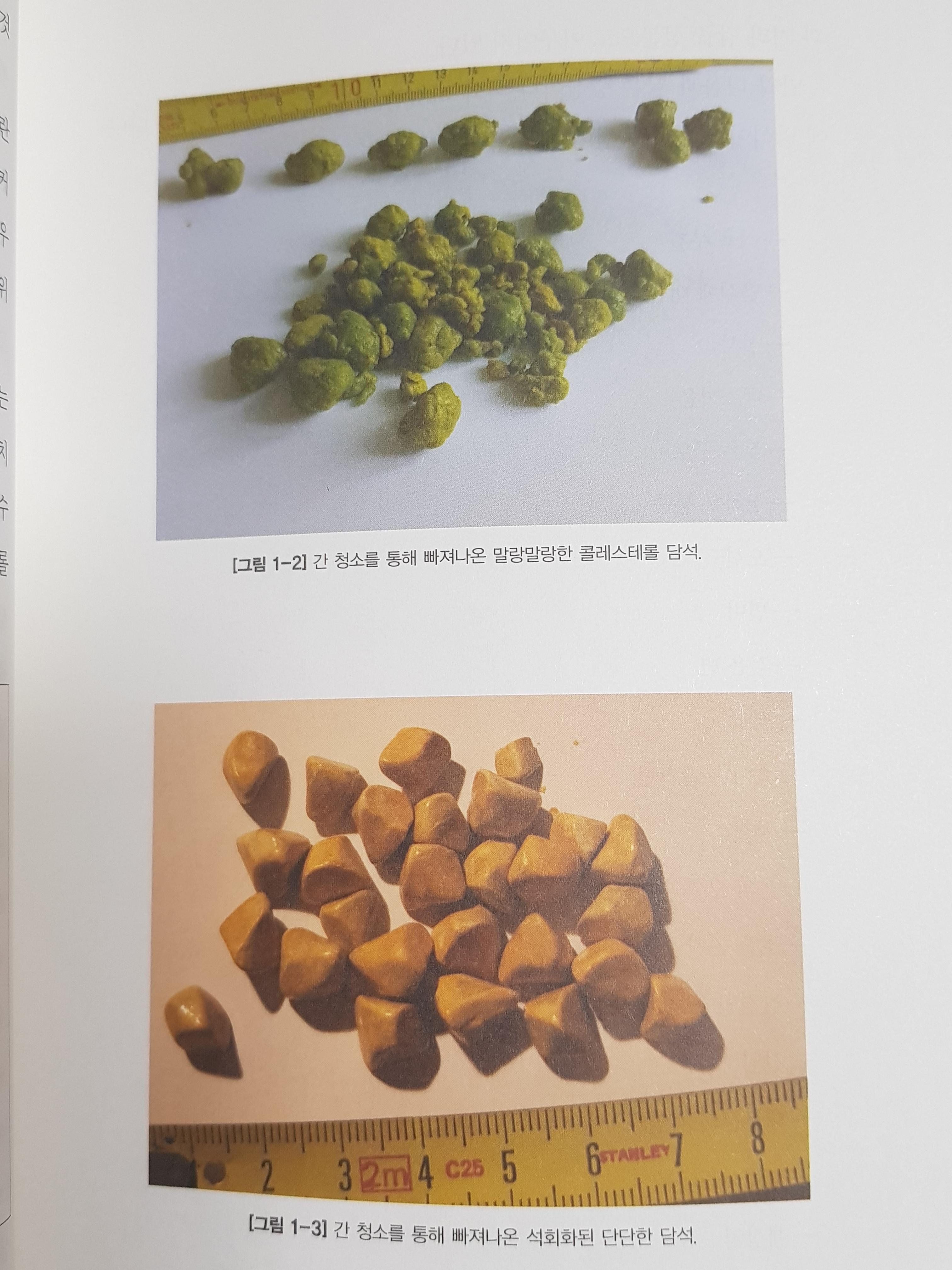 책에 나온 초록색깔의 콜레스테롤 담석이 나왔다